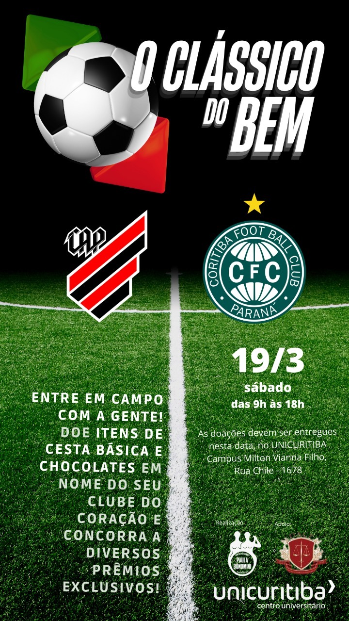 A parceria de três grandes marcas – símbolos de Curitiba – vai garantir uma Páscoa melhor e mais feliz para dezenas de famílias paranaenses. Juntos, UniCuritiba, Athlético e Coxa se unem para promover o “Clássico do Bem”. O objetivo da ação é arrecadar itens da cesta básica (alimentos não perecíveis) e chocolates que serão doados a uma entidade beneficente da cidade.